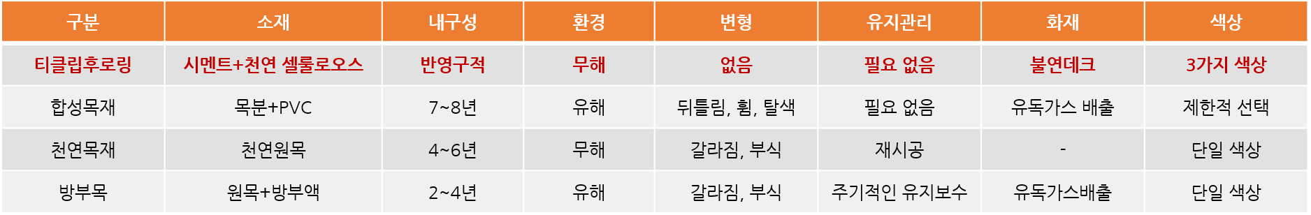 그럼 여기서 끝으로 목재 데크와 합성목재 그리고 티클립 후로링에 대한 간단 비교 내용으로 포스팅을 마칩니다.