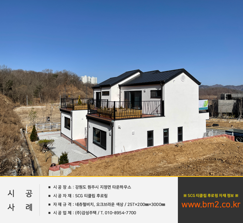 안녕하세요 불연 건축자재 리딩 컴퍼니 비엠2(주)입니다. 요즘 주위를 보면 타운하우스 공사 현장을 많이들 보는데, 예전과 다르게 독특한 외관과 디자인으로 눈에띄는 타운하우스를 볼 수 있습니다. 타운하우스에서 멋진 외관과 디자인에 꼭 빠질 수 없는 장소가 바로 야외 테라스 및 마당 등에 설치되어 있는 데크가 아닐까 생각합니다. 오늘은 강원도 원주시 지정면에 위치한 타운하우스에 SCG 티클립 후로링 데크재가 시공되었습니다.