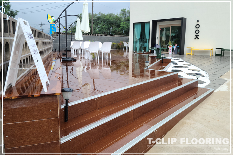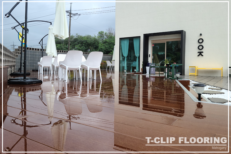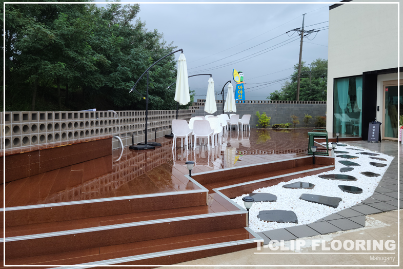 데크에 올라가보면 정말 안전하다는 걸 느낄 수 있습니다. 카페 앞쪽부터 건물 뒷쪽까지 티클립 후로링으로 시공을 했습니다. 비가왔어도 사이사이로 물이 고이지 않고 빠지기 때문에 걱정이 없습니다.